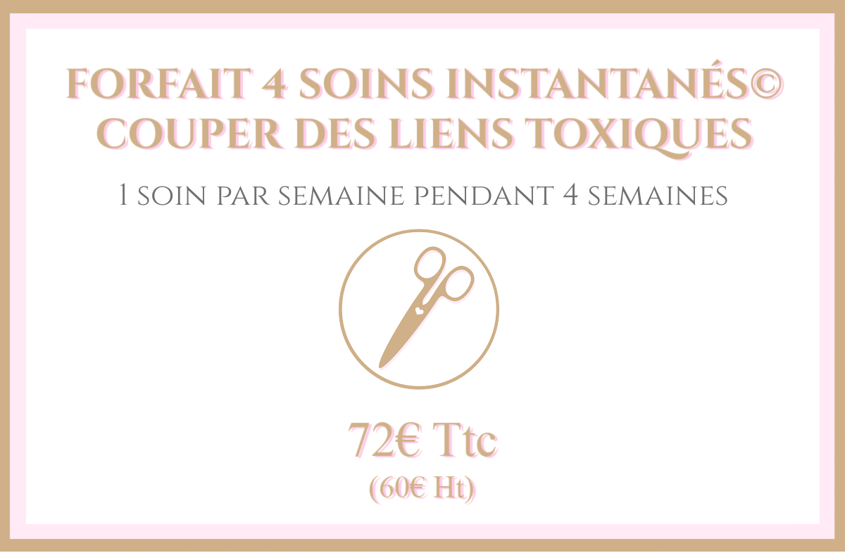 Selon vos envies et besoins, vous pouvez opter pour le "Pack de 4 Soins Instantanés© Couper les Liens Toxiques" qui vous permet de faire un Soin Instantané de 55 minutes par semaine, pendant 4 semaines (1 mois).